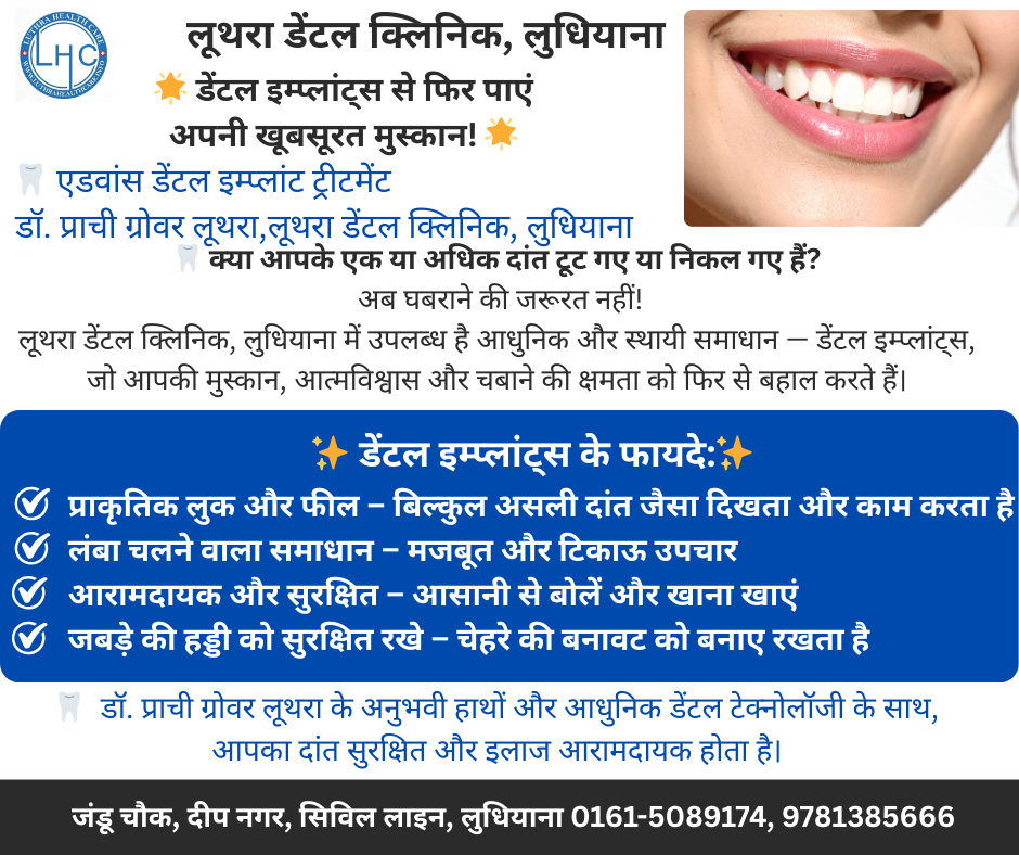 🦷✨ लूथरा डेंटल क्लिनिक, लुधियाना ✨🦷 🌟 डेंटल इम्प्लांट्स से फिर पाएं अपनी खूबसूरत मुस्कान! 🌟 क्या आपके एक या अधिक दांत टूट गए या निकल गए हैं? अब चिंता छोड़िए… समाधान है हमारे पास! 👩⚕️ डॉ. प्राची ग्रोवर लुथरा एडवांस डेंटल इम्प्लांट ट्रीटमेंट एक्सपर्ट 💎 लुथरा डेंटल क्लिनिक में उपलब्ध है आधुनिक और स्थायी […]